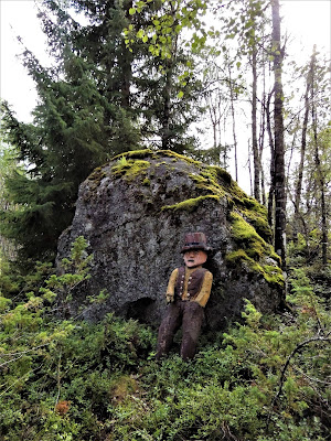 Halvvägs upp gick vi förbi en stor sten. En gubbe, utskuren i trä, lutade sig emot stenen. Han såg aningen trött ut ...men vi däremot var inte trötta utan traskade lätt uppför den inte alltför höga kullen. Lite nyfikna var vi allt....