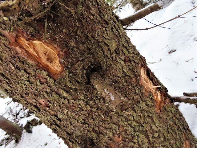 Vi fick också syn på en stor gammal gran som tydligen sett sina bästa dagar och numera hyste ett matförråd för hungriga hackspettar. Det blev en lång skogspromenad och det var väl tur det, för idag har det inte blivit många steg gjorda i yrvädret.