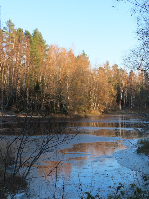 Det konstiga med denna vinter-månad oktober är att många lövträd har kvar sina löv. Bilden ovan knäppte jag under gårdagens promenad. I natt hade vi -12 grader. Att det varit så kallt har berott på högtrycket som parkerat sig över de norra delarna av landet och det har dessutom motat bort många nederbördsmoln som normalt har sin bana över oss så här på hösten.